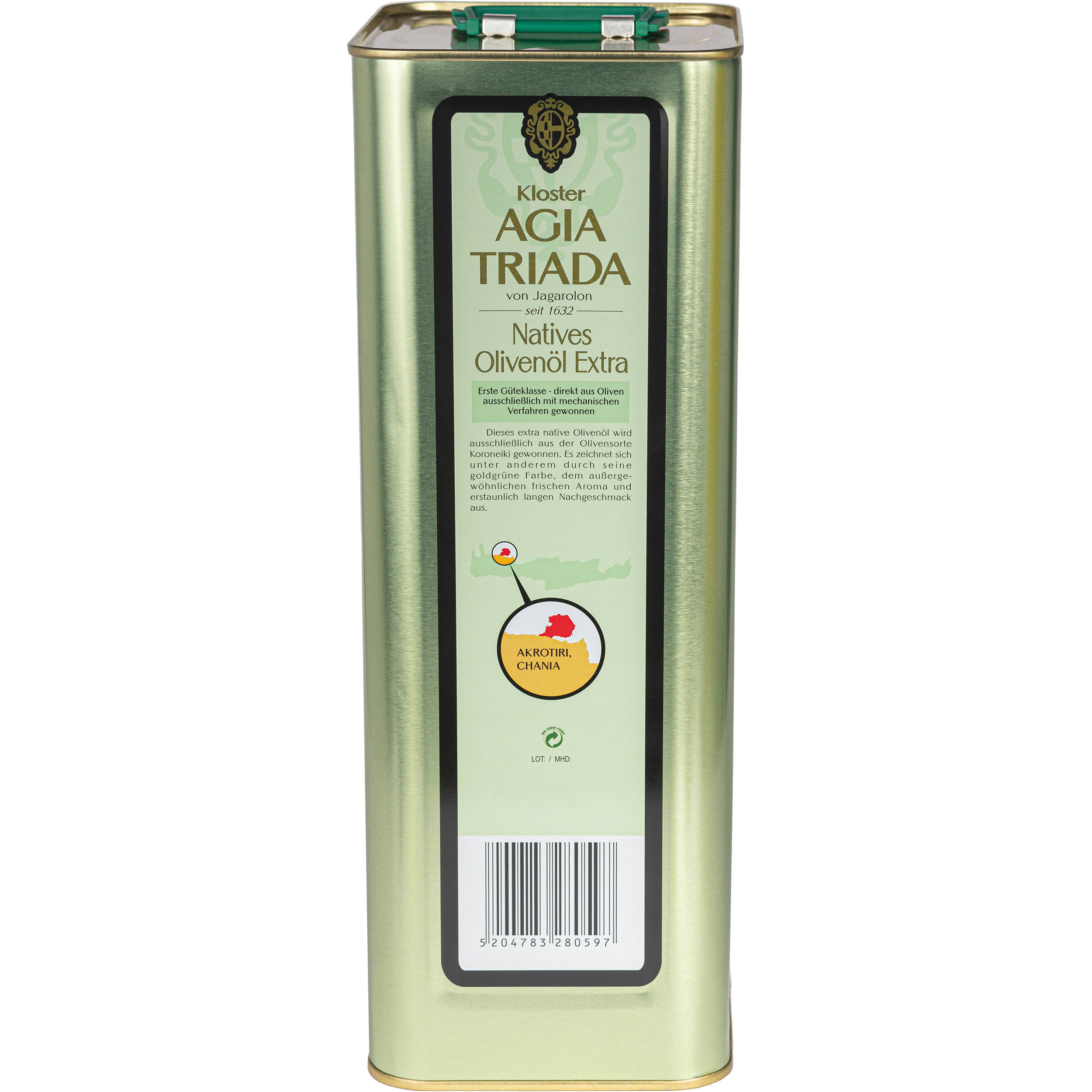 Dieses extra native biologische Olivenöl verdankt seine Qualität, seinen vorzüglichen Geschmack und reiches Aroma, seinem Ursprungsort, der Bezirk von Akrotiri in der Präfektur von Chania auf der Insel Kreta. Es zeichnet sich unter anderem durch seine goldgrüne Farbe, den außergewöhnlichen frischen Aroma und erstaunlich langen Nachgeschmack aus. Vollkommene Gesundheit des Olivenbaums und seiner Frucht wird erzielt, indem man ausschließlich ökologische Methoden zur Schädlingsbekämpfung einsetzt. Die Verarbeitung und Normierung wird von den Mönchen innerhalb des Klosterkomplexes durchgeführt. Auf dieser Weise wird ein garantiertes Qualitätsprodukt namens Agia Triada erzielt.