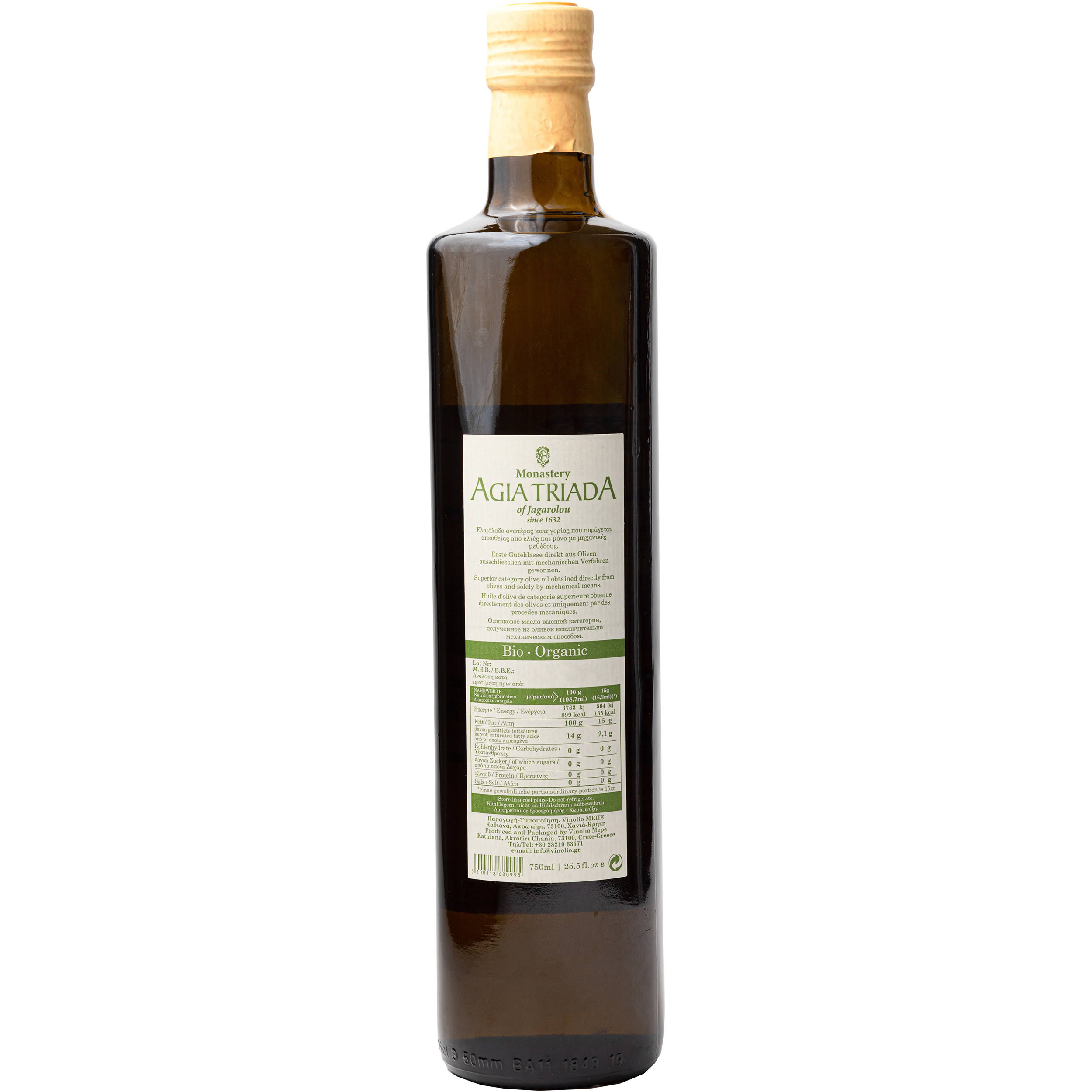 Dieses extra native biologische Olivenöl verdankt seine Qualität, seinen vorzüglichen Geschmack und reiches Aroma, seinem Ursprungsort, der Bezirk von Akrotiri in der Präfektur von Chania auf der Insel Kreta. Es zeichnet sich unter anderem durch seine goldgrüne Farbe, den außergewöhnlichen frischen Aroma und erstaunlich langen Nachgeschmack aus. Vollkommene Gesundheit des Olivenbaums und seiner Frucht wird erzielt, indem man ausschließlich ökologische Methoden zur Schädlingsbekämpfung einsetzt. Die Verarbeitung und Normierung wird von den Mönchen innerhalb des Klosterkomplexes durchgeführt. Auf dieser Weise wird ein garantiertes Qualitätsprodukt namens Agia Triada erzielt.