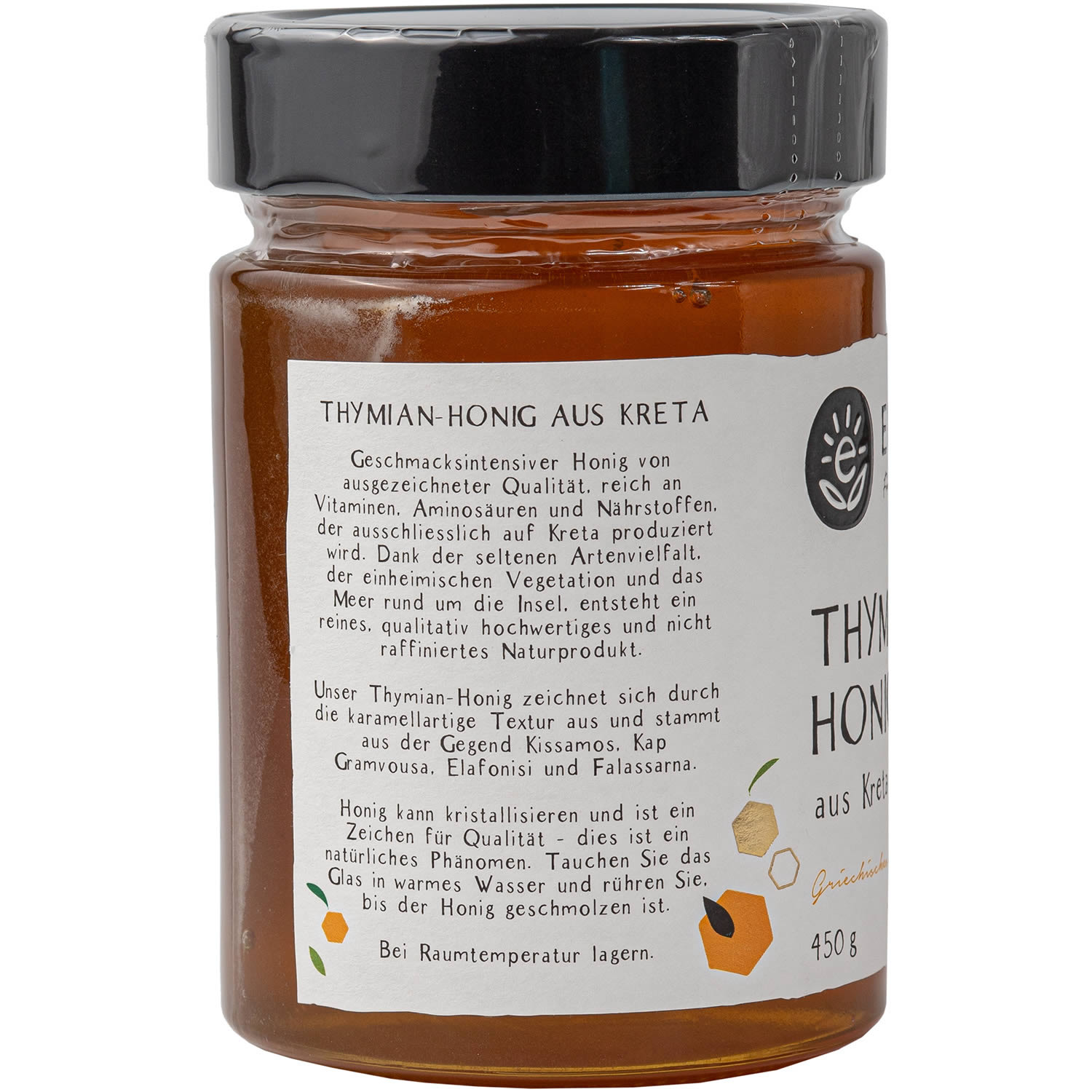 Unser Edesma Honig ist ein geschmackintensiver Honig von ausgezeichneter Qualität, reich an Vitaminen, Aminosäuren und Nährstoffen, der ausschließlich auf Kreta produziert wird. Dank der seltenen Artenvielfalt, der einheimischen Vegetation und das Meer, das die Insel umgibt, entsteht ein reines, qualitativ hochwertiges und nicht raffiniertes Naturprodukt. Dieser Honig wird aus dem Thymian-Nektar in der Gegend Kissamos, Kap Gramvousa, Elafonisi und Antike Falassarna gesammelt.