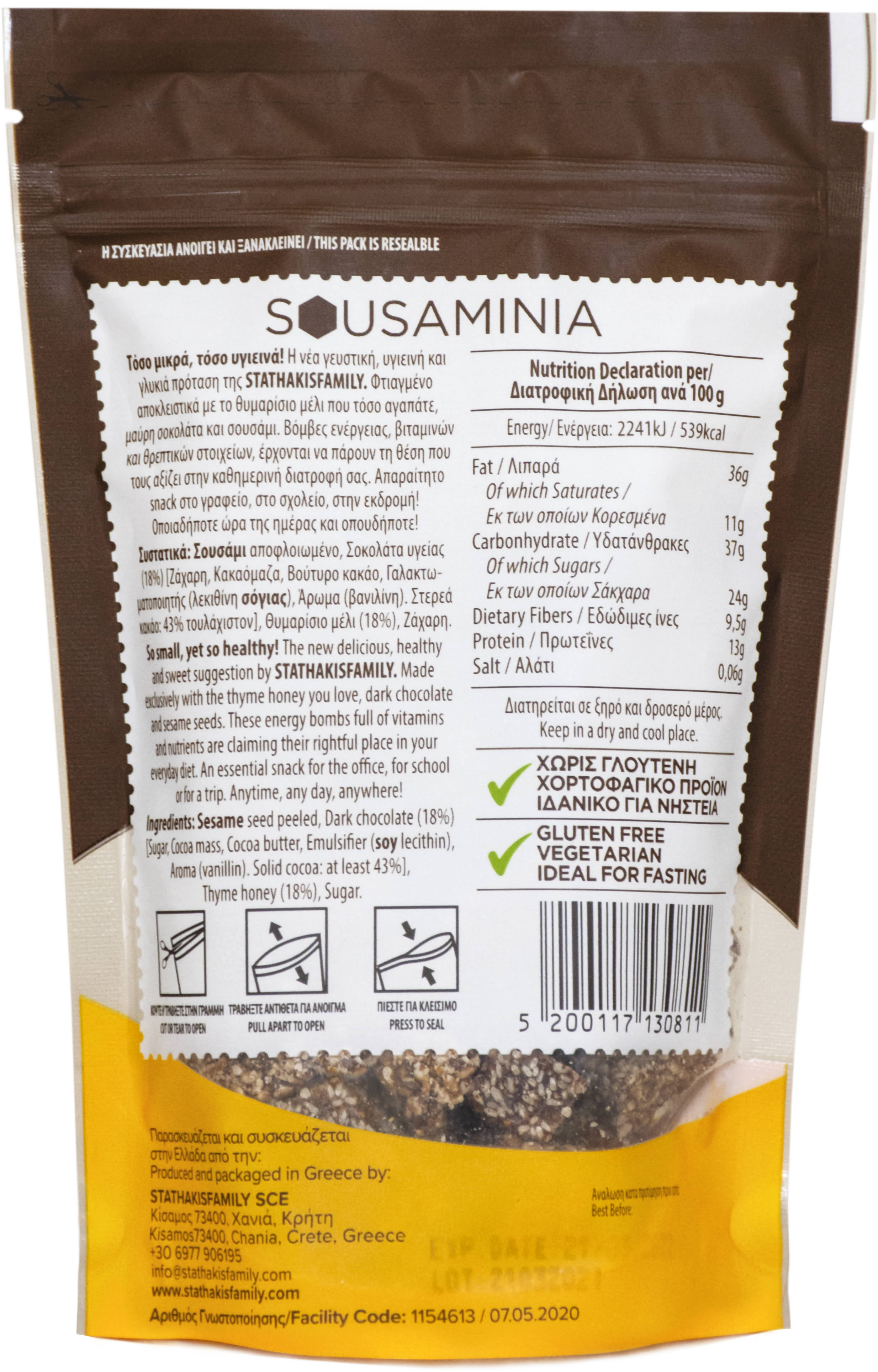| Zutaten | Sesamsamen, dunkle Schokolade (Kakaomasse, Kakaobutter, Sojalecithin, Vanillin), Thymian Honig, Zucker |