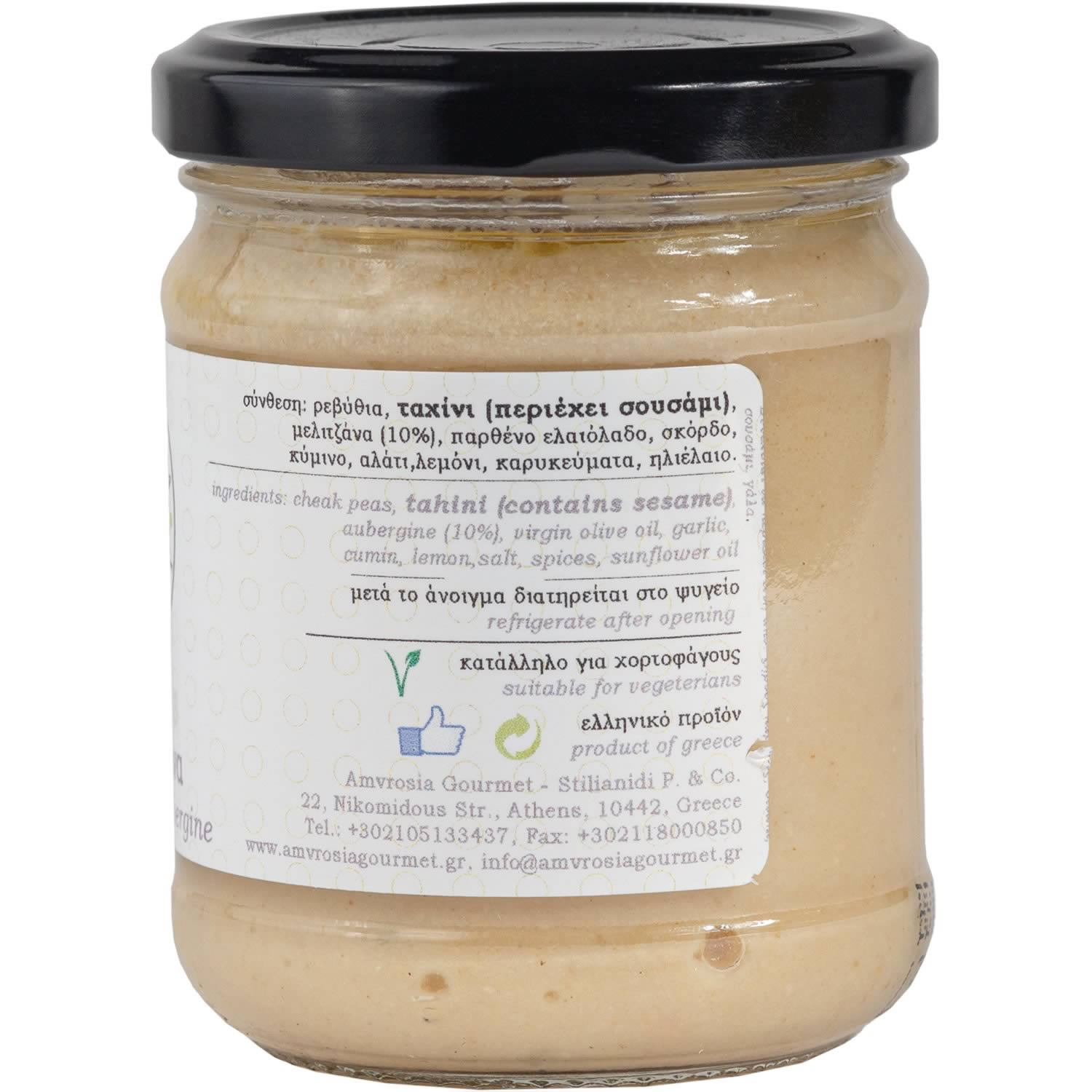 Aus Kichererbsen, Τahini (Sesampaste), feinster Aubergine (10 %) und nativem Olivenöl wird dieses Pâté mit ausgewählten Gewürzen und Salz zubereitet. Da unsere Pâtés ausschließlich kalt verarbeitet werden, bleibt der frische Geschmack erhalten und ist ideal für die moderne hochwertige Küche. Durch die leichte und cremige Beschaffenheit, eignen sich diese Pâtés vorzüglich als Dip, Brotaufstrich, zur Verfeinerung von Salatdressings oder kann mit Fetakäse und sonnengetrockneten Tomaten serviert werden. Besonders geschmackvoll auch zur Zubereitung von Pasta oder Fleisch.